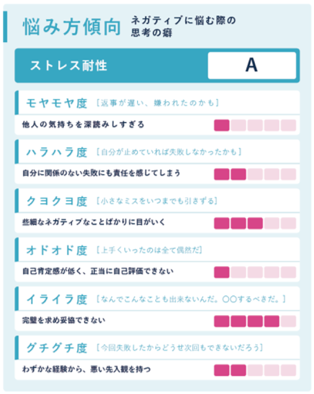 応募者個人結果画面のデータサマリーから、ストレスに関する項目を確認いただけます。環境の変化に対する対応力などから、受検者のストレス耐性をS~Dの5段階で算出します。また、人物特性をもとにネガティブに悩むときの思考の癖も明らかになるため、メンバーごとに適切な対応が把握できます。