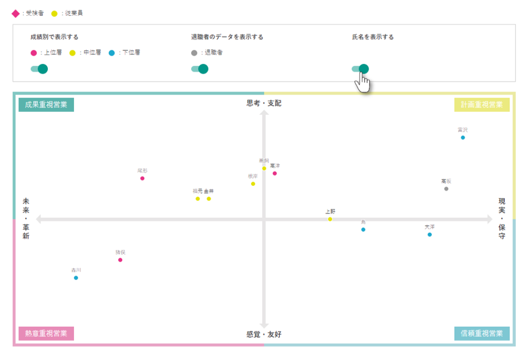応募者個人結果画面のデータ比較から、散布図を確認いただけます。検査で明らかになる思考行動特性をもとにプロットされており、退職者と比較することで、早期離職者の営業タイプにどの程度近いかを直感的に判断することができます。