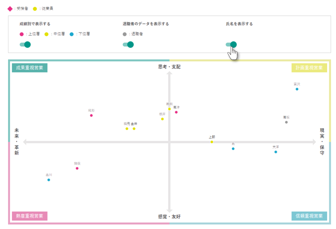 SALES SCOREでは、個人の検査結果を分析するだけでなく、登録された実績をもとに成績上位層や下位層の特徴を可視化することができます。優秀者の傾向を可視化することにより、社内で活躍できる人材を採用するための基準を数値化していただくことが可能です。