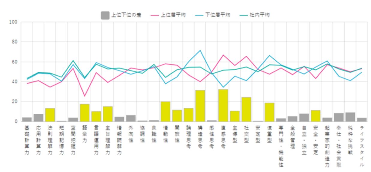 企業傾向分析から、High-Low分析を確認いただけます。成績上位層と他の従業員の平均点を項目ごとに比較することで、数値の差からハイパフォーマーがの特徴が可視化され、客観的な採用基準としてご活用頂けます。