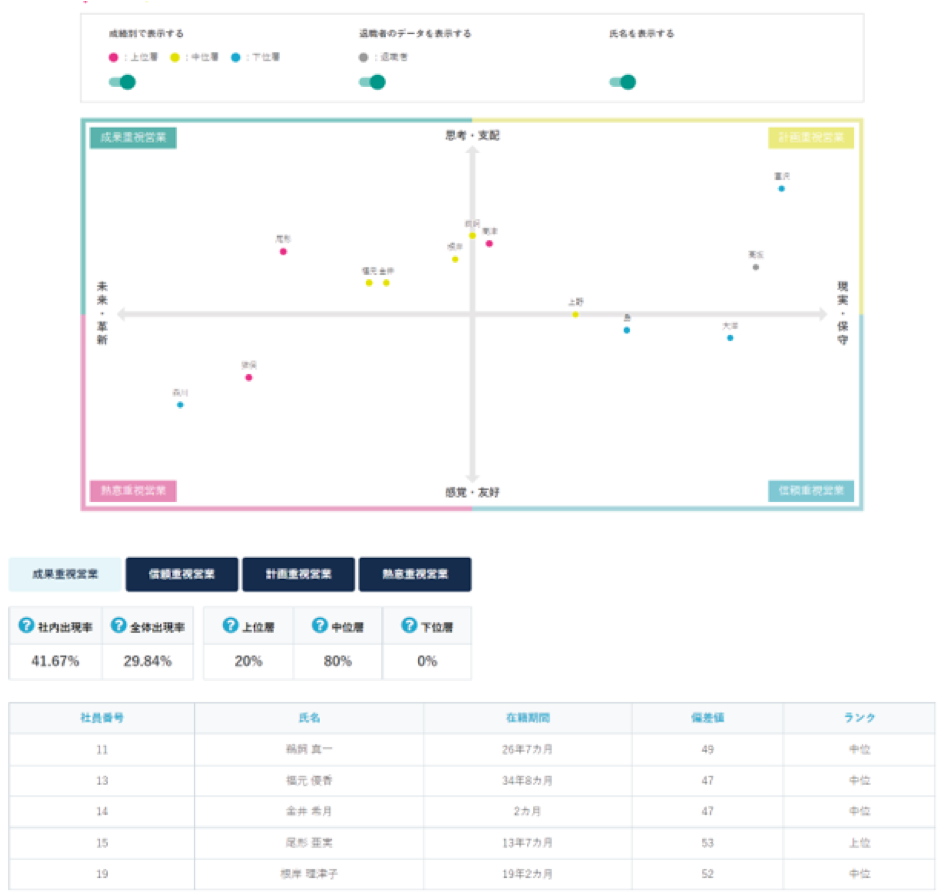 企業傾向分析から営業タイプ傾向を確認いただけます。従業員を思考行動特性データをもとに4つの営業タイプに分類し、プロット図で表示します。社内におけるタイプごとの人数や、優秀層の多いタイプなどが数値化されており、組織編成や採用計画の参考に活用いただけます。