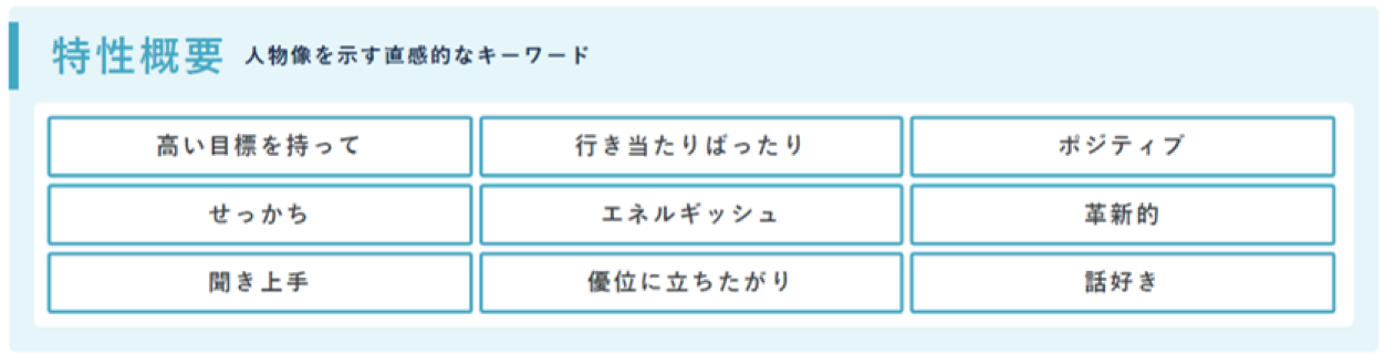 データサマリーの最下部から、特性概要を確認いただけます。人物の特徴や志向性をもとに、受検者の人となりを9つのキーワードで表示しており、専門的な知識がなくても簡単に結果を読み取ることができます。