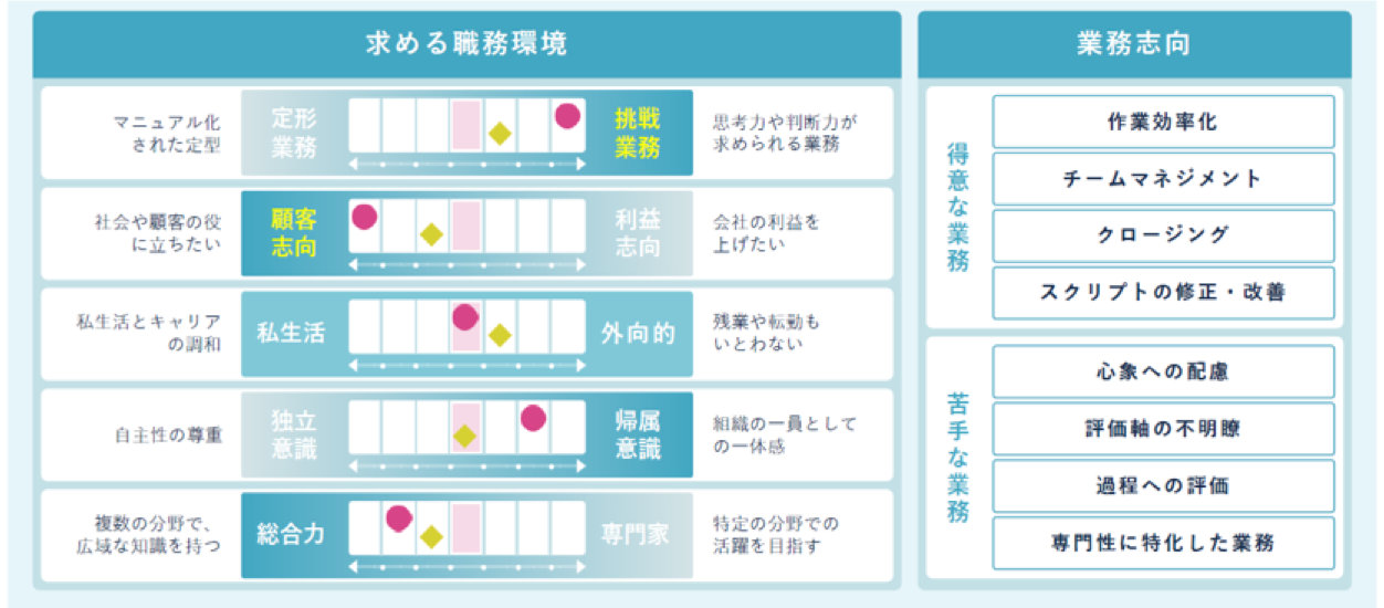 データサマリーから、求める職務環境や業務適性を確認いただけます。得意とする業務や理想とする仕事との関わり方が具体的に記載されており、メンバーが本当にやりたいことを理解することで、やりがいを持って仕事に取り組める、モチベーションの高いチーム構築を実現します。