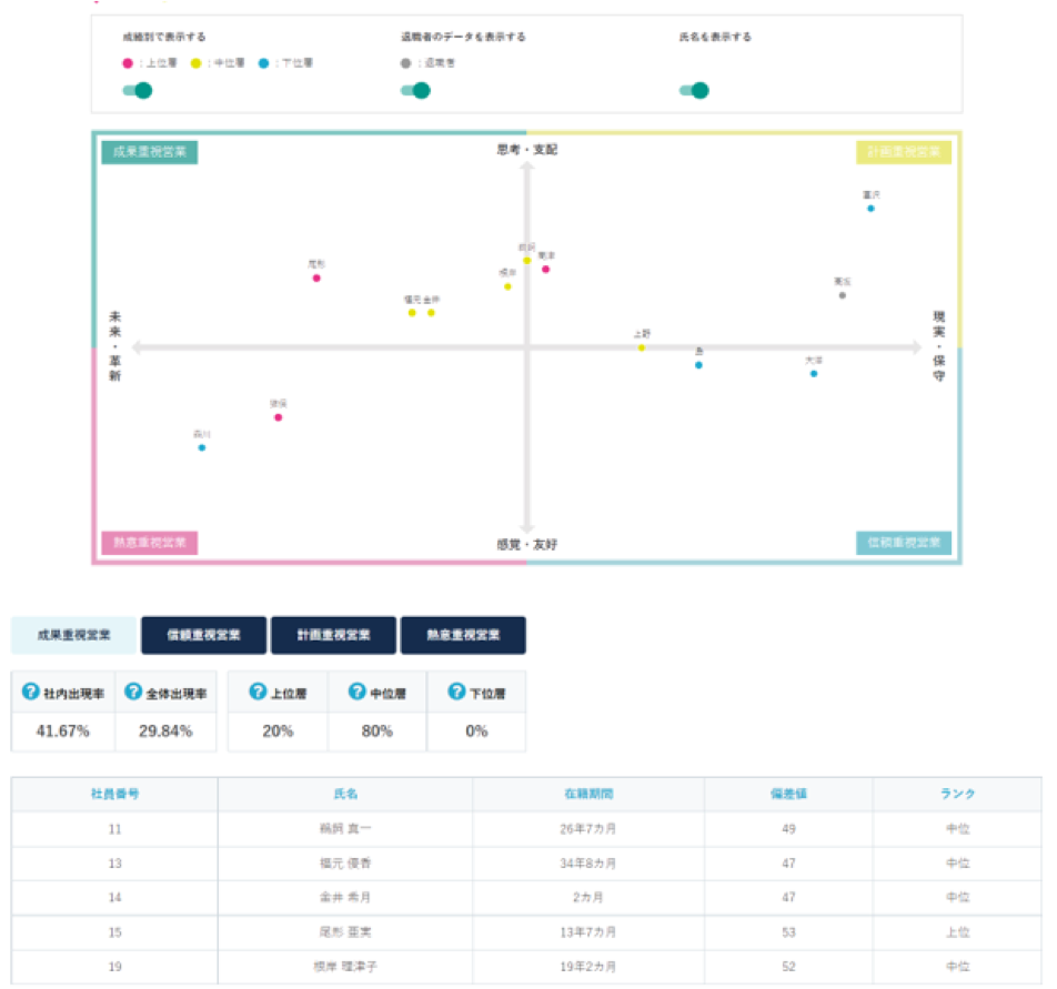 従業員のタイプや価値観を深く理解することで、より能力を発揮できる環境の構築や、効果的な面談を実施することが可能になります。SALES SCOREでは受験者のパーソナリティが営業シーンにどのように影響するか、より業務をイメージしやすい形で表しており、直感的に受験者を理解できます。