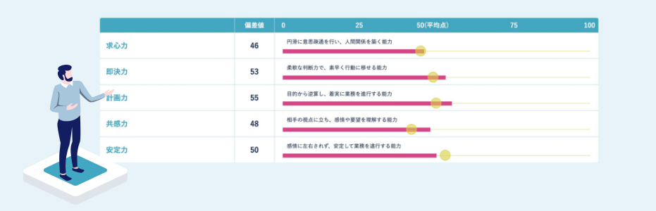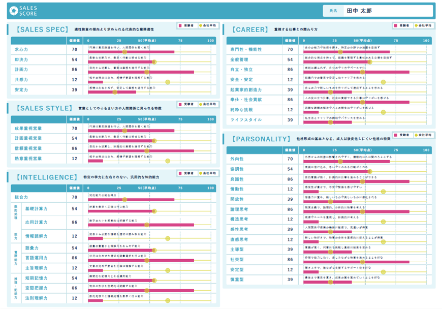 受検者の得点は3,000名を超える営業人材の得点をもとに偏差値化され、自社の会社平均値と比較して表示します。