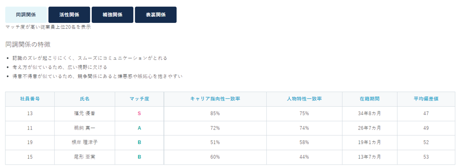 検査の結果から、従業員間の相性や特性の類似度が算出されます。