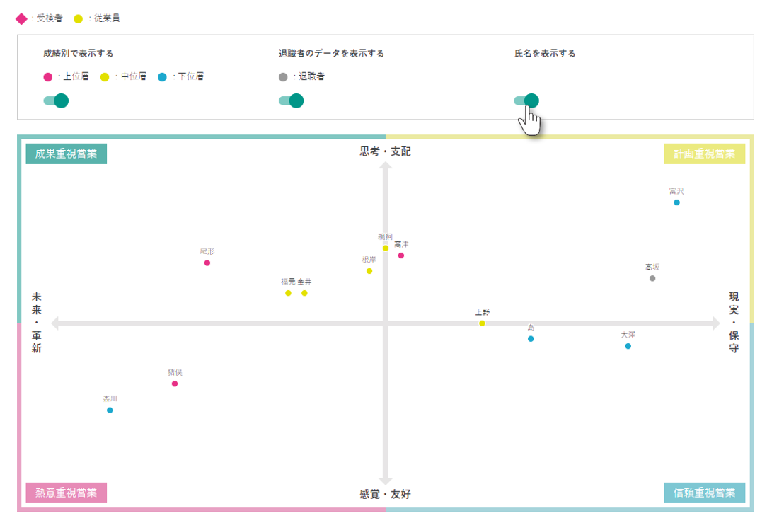 上部のコントローラーから、成績別での色分け、退職者の表示、氏名の表示の設定を行うことができます。