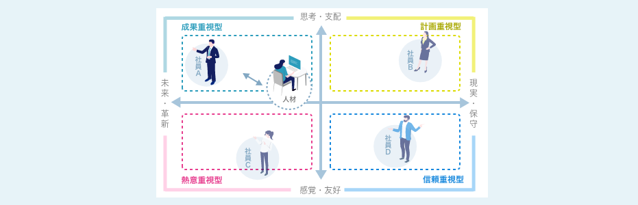 検査で明らかになる思考行動特性をもとに、受検者を「思考・支配↔感覚・友好」「未来・革新↔現実・保守」の2軸でプロットして表示します。