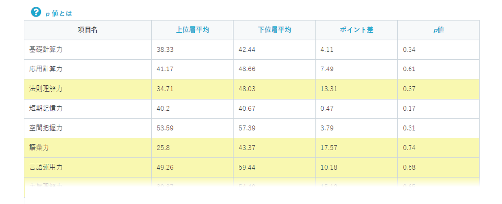 p値は統計的な指標として用いられる数値で、各項目のポイント差が偶然発生する確率を表しています。