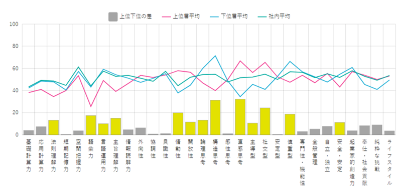 棒グラフは上位層と下位層の平均点の差を表しており、特徴的な差(10ポイント以上)の場合は黄色でハイライトされます。