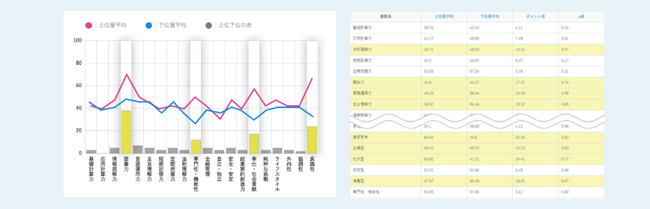 各項目における上位層・下位層の得点平均と、平均点の差を一覧で表示しており、特徴的な差(10ポイント以上)の場合は黄色でハイライトされます。