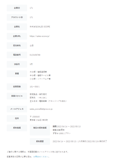 その他、登録内容の変更やプラン内容の詳細に関しましては、SALES SCORE事務局 support@sales-score.jp までご連絡ください。