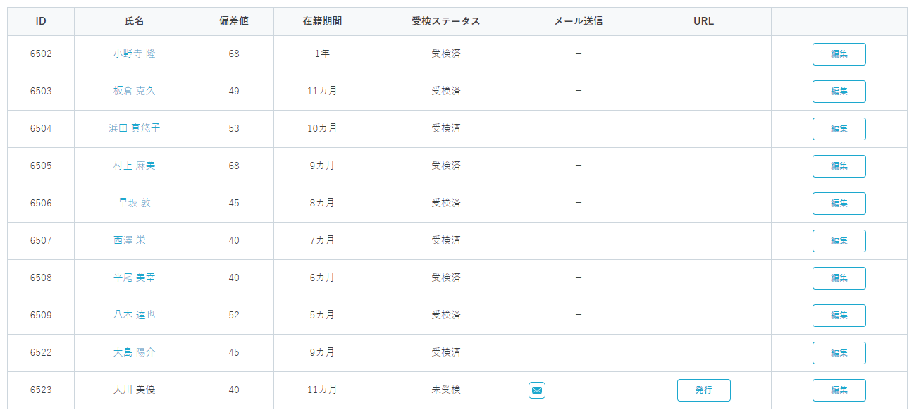 | URL | 受検画面をメールではなく直接URLを発行して表示する際に用います。「発行」ボタンを押すと、URLが発行されます。 |