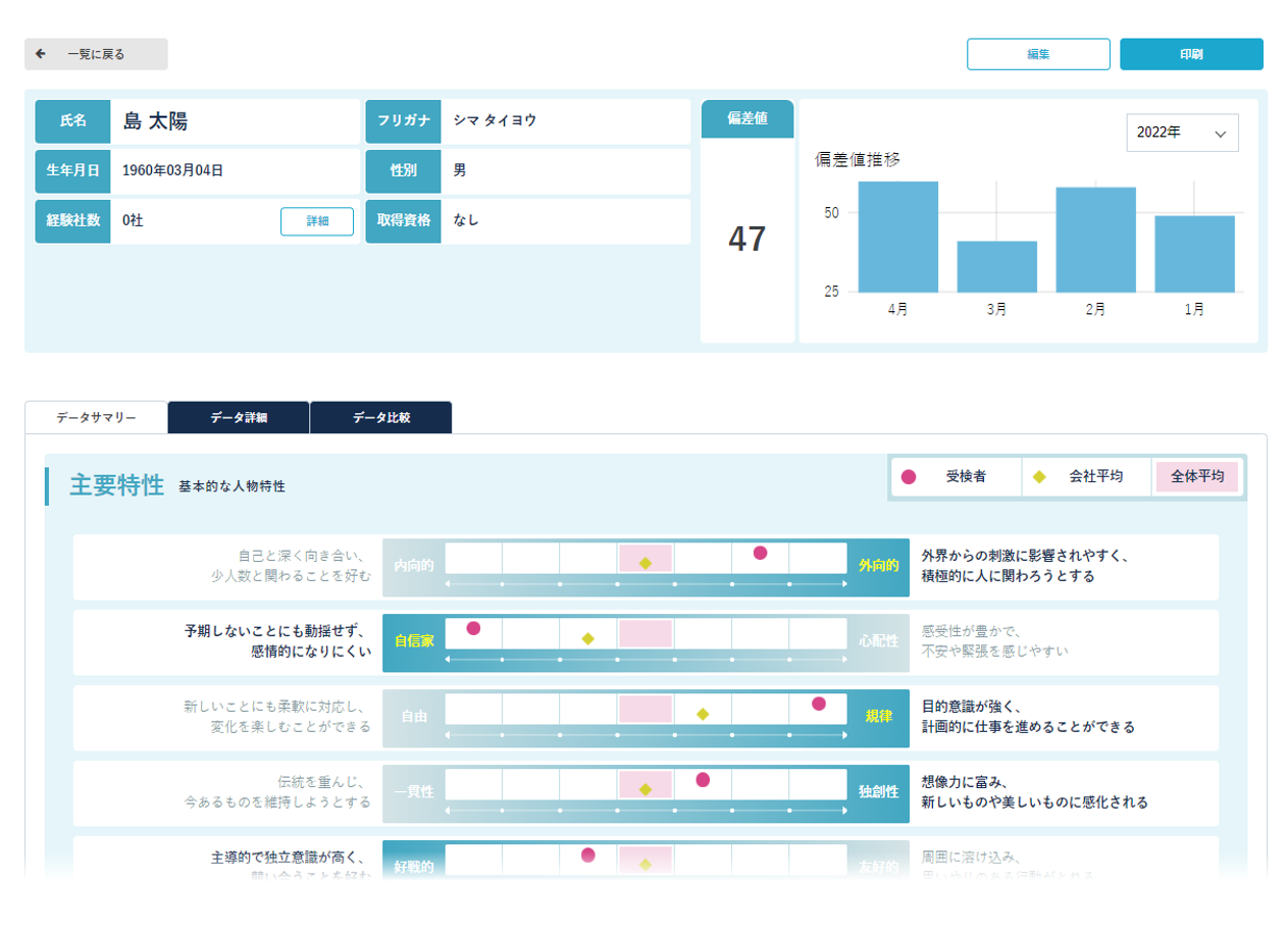適性検査結果を表示します。タブを切り替えることで、データサマリ・データ詳細・データ比較それぞれの画面を閲覧いただけます。