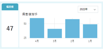 最新月の偏差値のほか、指定された年度の実績から算出された偏差値推移を棒グラフで表示します。