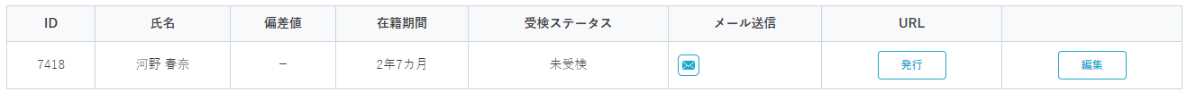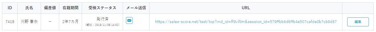 | 発行済 | メールまたは受検URLを発行したユーザーに表示されます。 受検URLの有効期限も合わせて表示されます。 |
