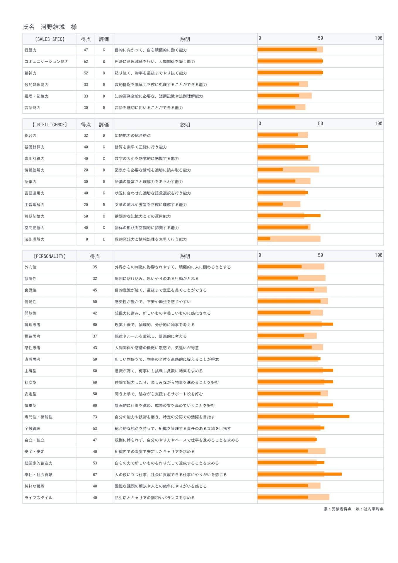 適性検査より取得した項目を表示します。 受検者の得点(濃)と従業員平均値(淡)との比較を表示します。